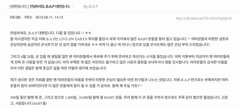 As you know well, B.A.P is currently touring for LIVE ON EARTH as we’re visiting many BABYs with each country.^^ With your warm supports and attention, I think the concerts have been a success with makes me really happy ㅎㅎ Although it’s not over yet, I hope that you can continue to give much attention to the upcoming concerts as well!